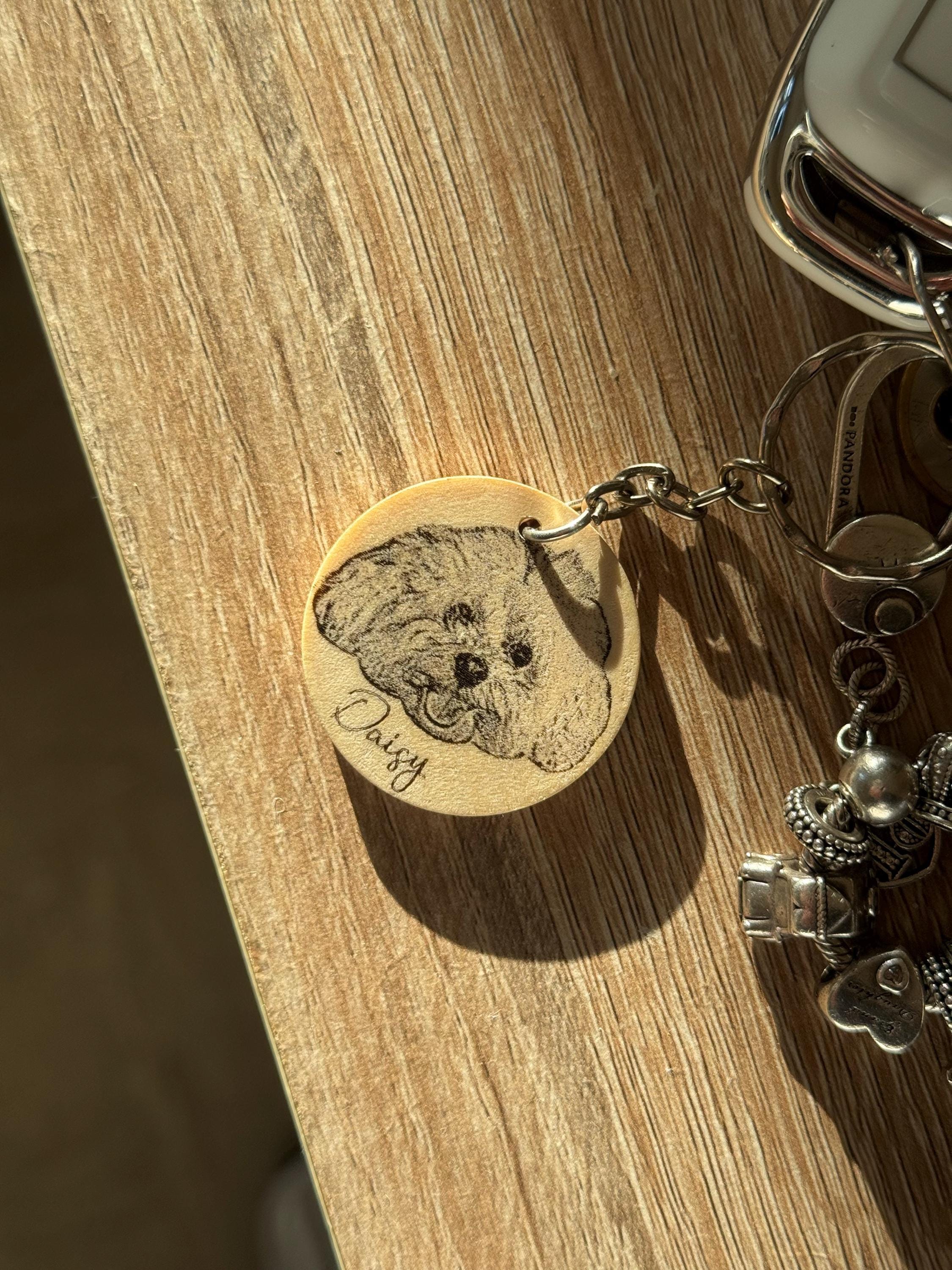 Engraved wood slice keyring with your chosen pet engraved onto the front. There is the option to add a name alongside the image of you animal if requested (as seen in example photos).