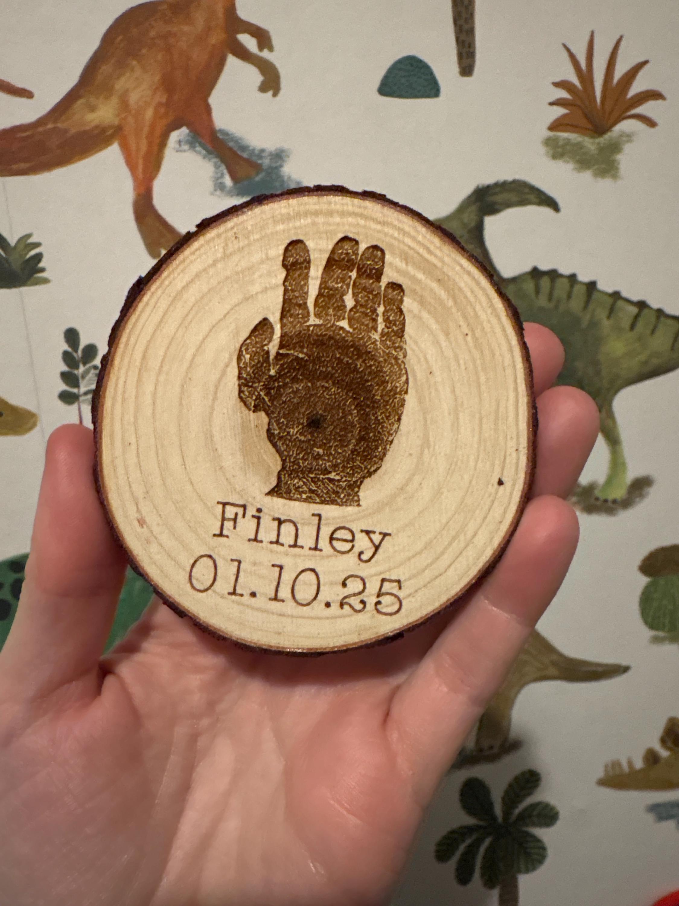This custom engraved wood slice ornament/magnet makes the perfect gift or keepsake to display your little ones foot print.