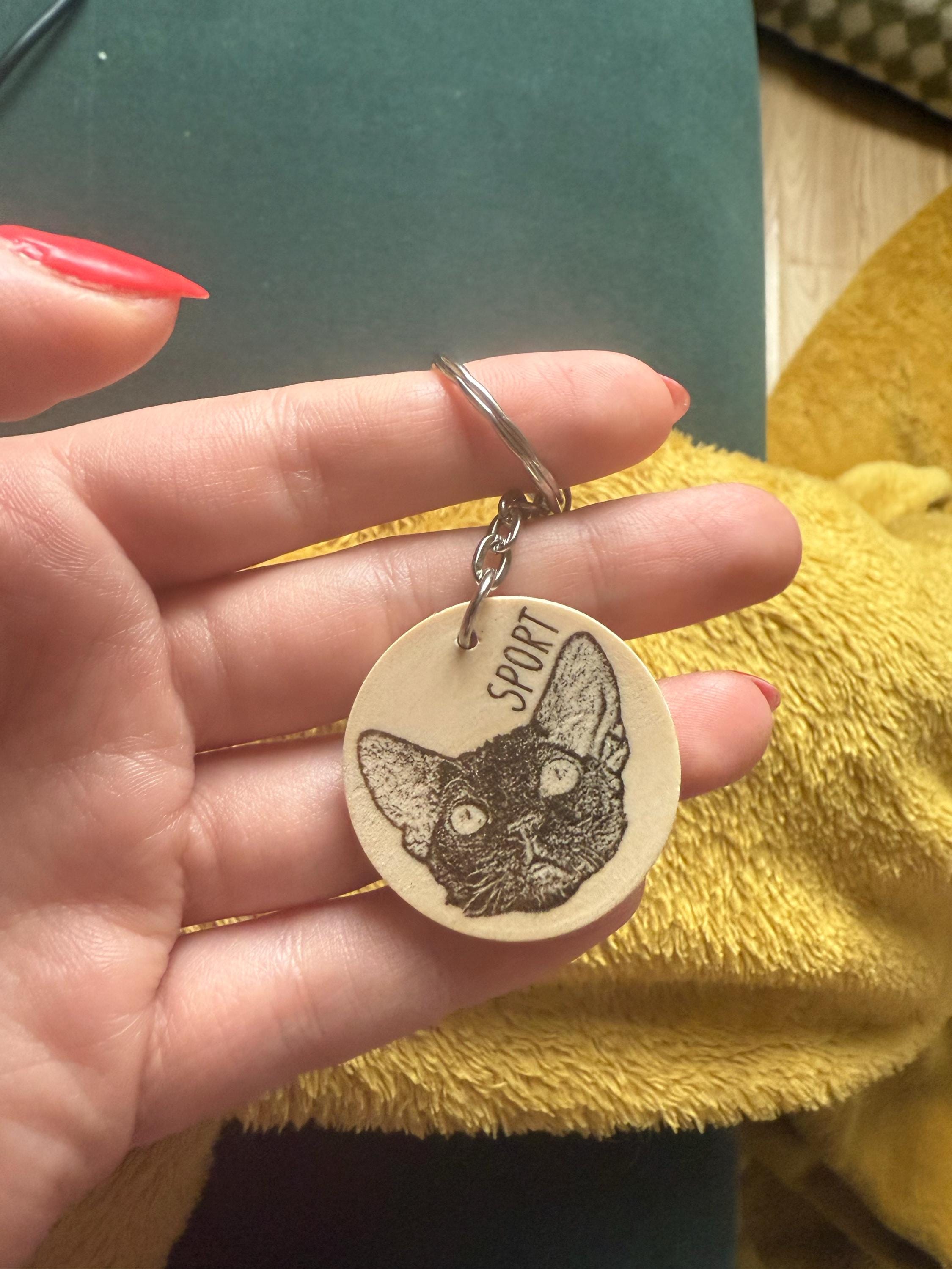 Engraved wood slice keyring with your cat engraved onto the front. There is the option to add a name alongside the image of you animal if requested (as seen in example photos).